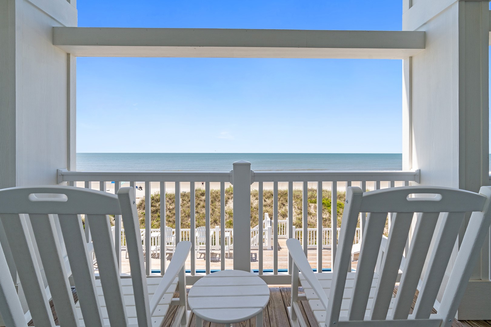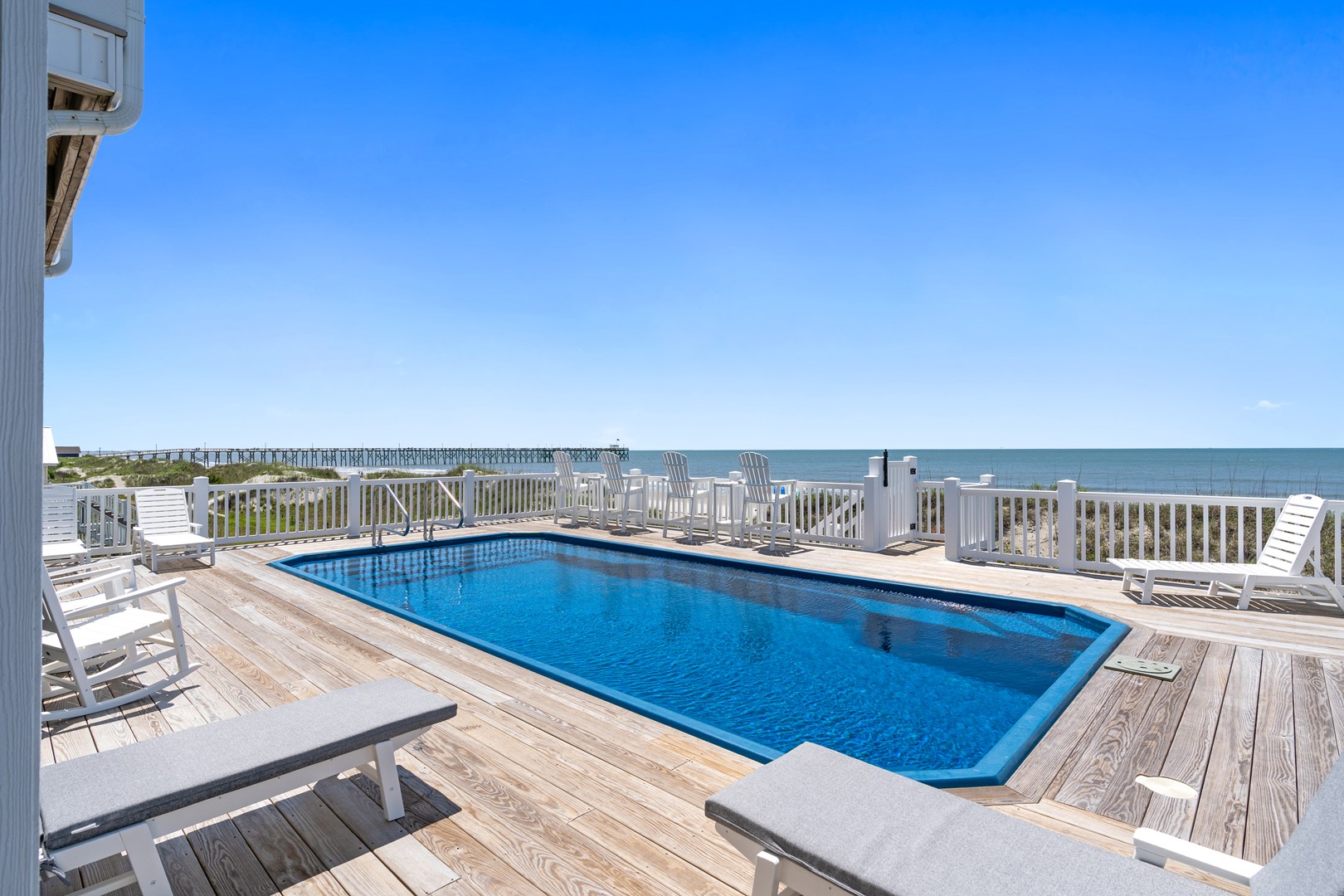 You must have done something right because you made it to BLUE HEAVEN!  OCEANFRONT LUXURY at its FINEST!  Smell the ocean air, listen to the waves crash and take in the views of Yaupon Pier from your own private deck with extra-large drop in heated swimming pool!  Or, take in the same mind-boggling views of the open Atlantic BLUE from the top floor deck in this incredibly designed almost 3,000 sq.ft. home with inverted floor plan and ELEVATOR!  This 2-story luxury and dog friendly home provides 5 Bedrooms & 4.5 Bathrooms that will sleep up to 15 comfortably.(BR1:1K BR2:1K,1T BR3:1K,1T BR4:2TBunk(4T) BR5:1Q,1T. There are three ocean facing bedrooms, two of which will serve as Masters – one up and one down and all bedrooms have smart TVs which have been planned to be most comfortable and provide adequate sleeping for everyone. Upstairs you will find an open floor plan with oversized living and dining areas featuring an 85’ flatscreen TV with surround sound all accented by a fully equipped gourmet kitchen with Thermador induction cooktop and oven, two large refrigerators, quartz countertops, dramatic backsplash and ample space for more than one cook in the family to maneuver.   Outside you will be blessed with plenty of seating and tables, two outdoor TVs and outdoor speakers with Pandora music. The first level spacious pool deck has several lounge chairs and plenty of room for everyone to sunbathe all while taking in breathtaking ocean views.  The ground level enclosed foyer offers plenty of space for storage and gives way to a fenced-in yard between the protective dune and house where you can barbecue on the park style grill while the kids and dogs play safely underneath.  You’ll find it all in heaven – BLUE HEAVEN, and you earned this right after all.  Take a stroll on the beach to the pier, surf fish out front, take a nice outside shower, ride bikes down to lunch or dinner, or just relax with cold drinks from one of the many open decks – this LOCATION HAS IT ALL!   Just minutes from Southport, and a 45 to 60 minute drive to Wilmington and Myrtle Beach.  Book this exclusive luxury vacation rental now while you still have a chance!  Dog friendly with fee (max 2 dogs). Pool heater $100 per day. Check-In 3PM-5PM  Check-Out 10AM.